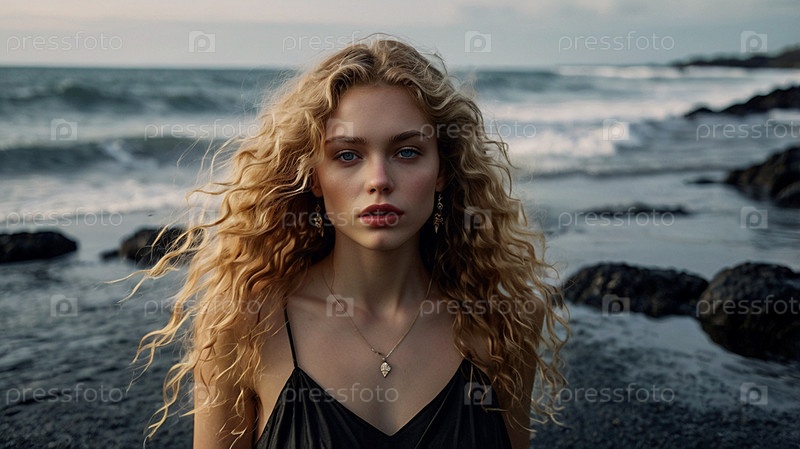 Портрет красивой женщины на пляже с черным песком против моря.Романтическая, спокойная и чувственная фотография девушки в нежном чёрном платье