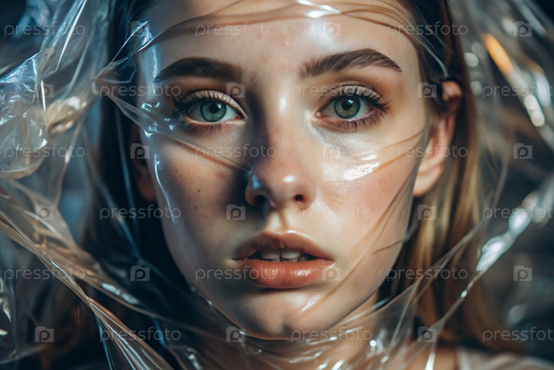 Девочка завернута в целлофан или сумку. Девушка задыхается. Пластиковое загрязнение планеты. Опасность для окружающей среды. Сокращение повторного использования пластика. Переработка. Концепция мусора