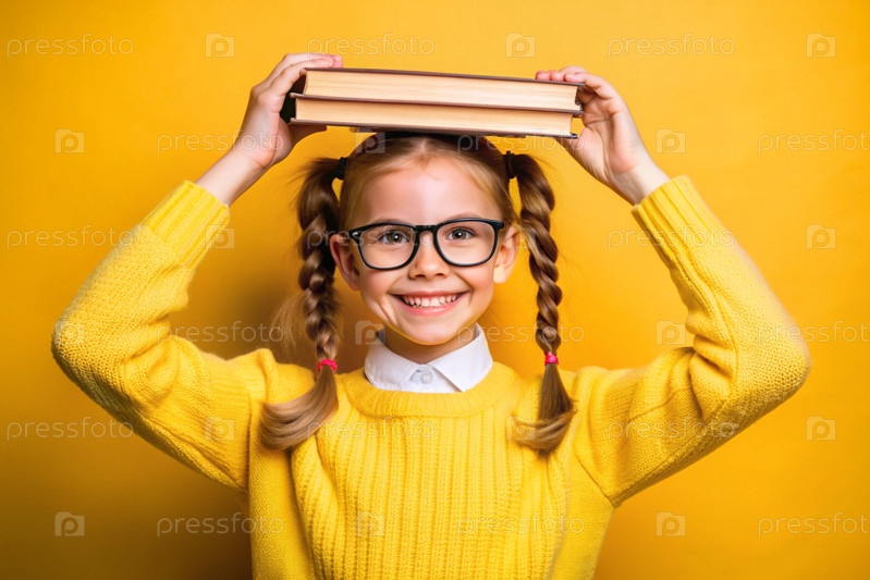 Красивая девушка с очками и книгами на голове. Ребенок впервые ходит в школу. Ребёнок на желтом монохромном фоне. Возвращение к школе