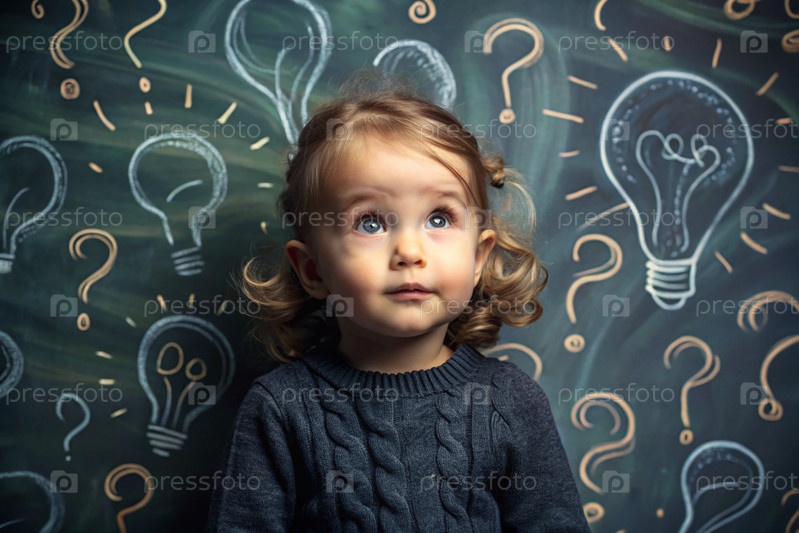 Развитие и образование детей. Вдумчивые девочки на темном фоне с лампочкой и вопросительными знаками. Брайнсторминг и концепция идеи