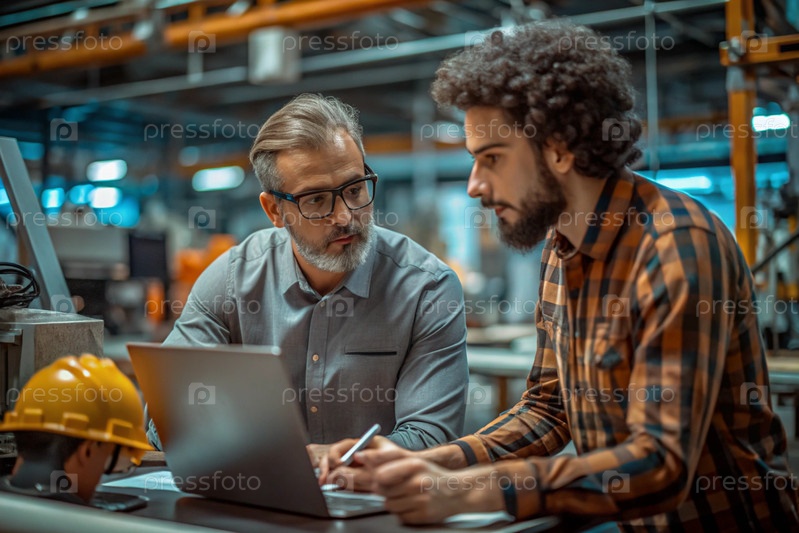 Профессиональный инженер, рабочий и техник в жестких шляпах используют клипборд для обсуждения работы на сталелитейном заводе