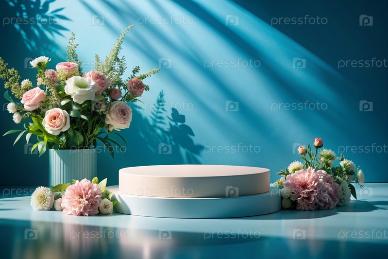 Минимальный фон для демонстрации продукта.Современная яркая трибуна с синей стеной.Креативный дизайн для презентации продукции