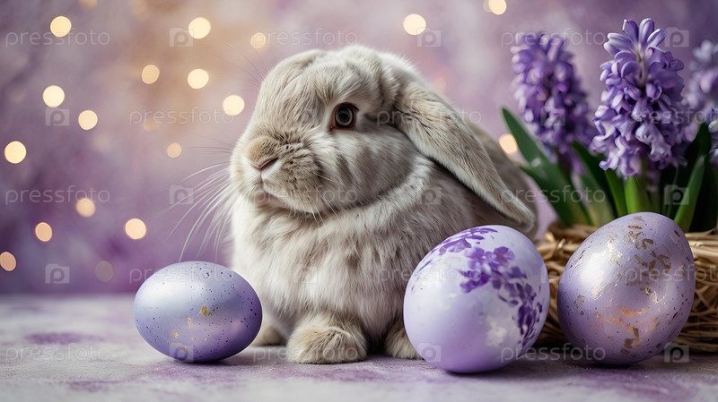Нежные пасхальные яйца, серый кролик и фиолетовые цветы гиацинта на пастельном акварельном фоне с нежными венами