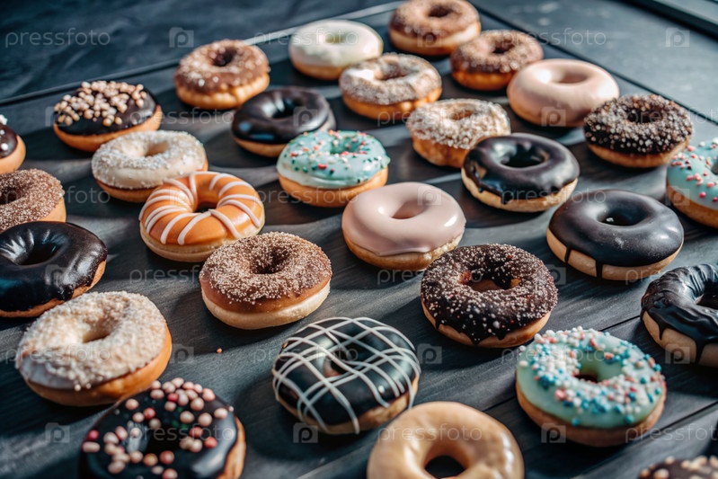 Вкусный десерт. больная коробка различных пончиков с красочными посыпаниями на столе. кондитерские изделия
