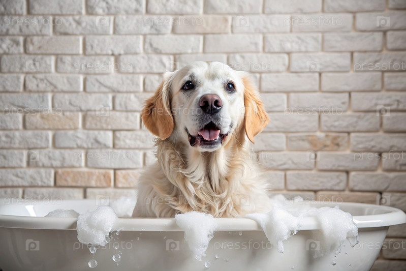 Золотой ретривер купается в пузырьковой ванне. Помыть собаку. Концепция ухода за домашними животными