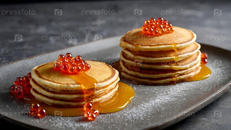 Русский праздник Масленицы. натюрморт с кучей блинчиков и красной икры