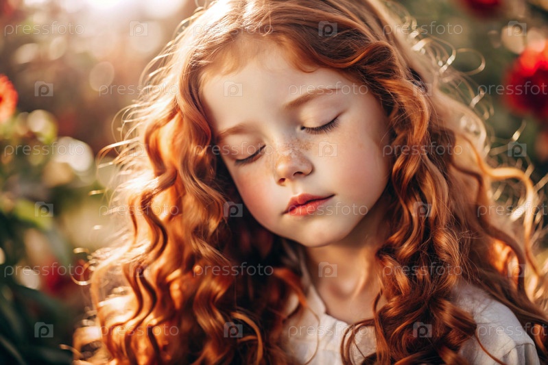 Портрет красивой маленькой рыжеволосой девочки с длинными волнистыми волосами и задумчивым взглядом.Власы развиваются и создают ощущение легкости и естественности