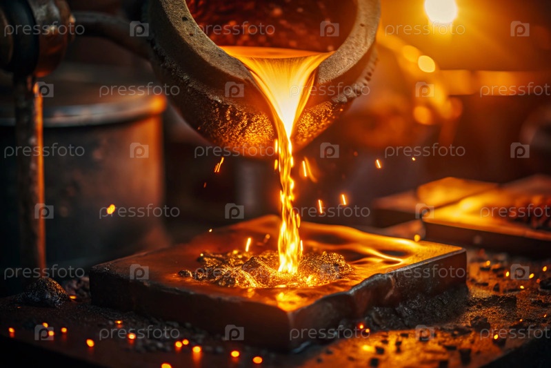 Тяжёлый труд. Фабрика, промышленность, металлургия. Отливка жидкой стали из ведра во время процесса литья в литейной фабрике. Производство металла