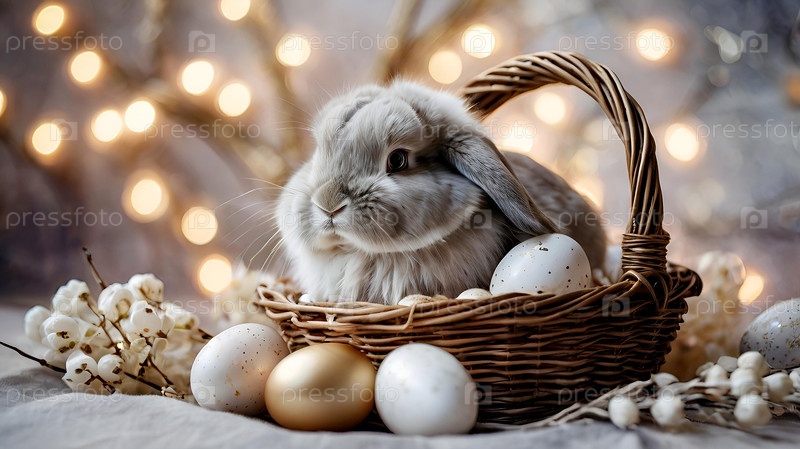 Нежные пасхальные жемчужинные яйца в корзине, кролик и нежные цветы на пастельном аквареле