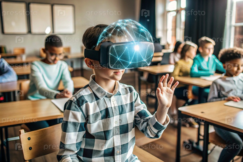 Мальчик с очками виртуальной реальности. Ребенок находится в классе, а другие ученики на заднем плане. Цифровой интерфейс отображается в наушниках