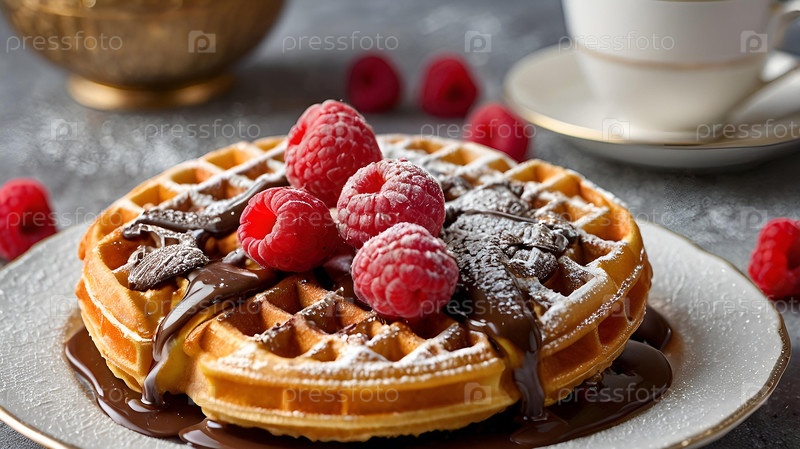 Свежевыпеченные бельгийские вафли украшены сахарным порошком, шоколадом и свежими ягодами