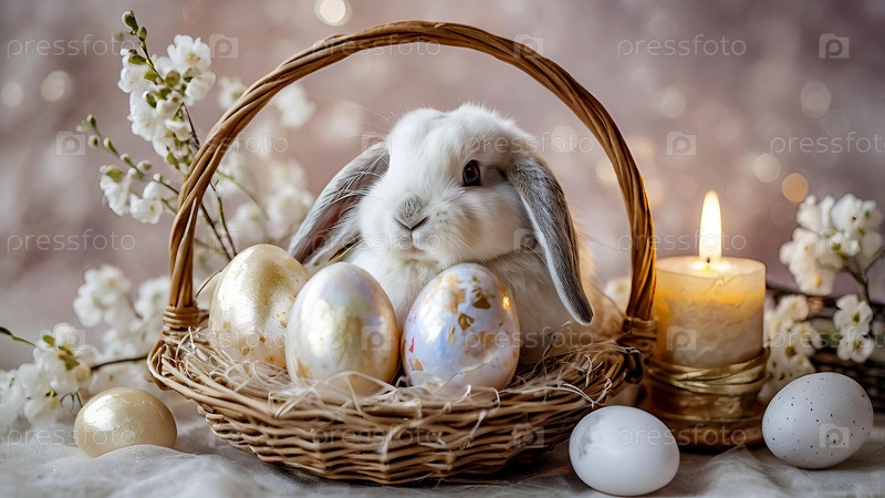 Нежные пасхальные жемчужинные яйца в корзине, кролик и нежные цветы на пастельном аквареле