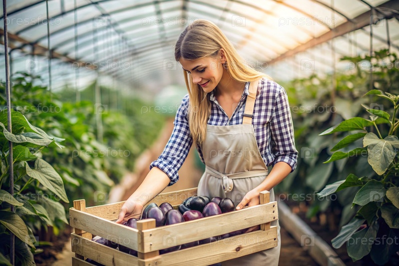 Сельскохозяйственная промышленность. деревянный ящик с баклажанами в руках фермерки. садовник собирает богатый урожай в теплице