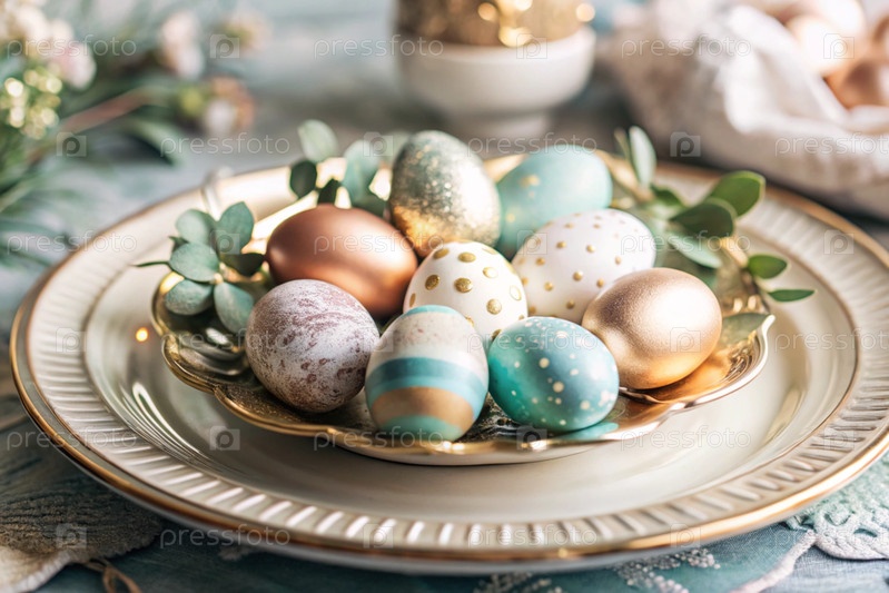 Пасхальный баннер. Настройка стола. Роскошная тарелка, пасхальные яйца с позолоченными красками. Концепция праздника Пасхи для кафе и ресторанов