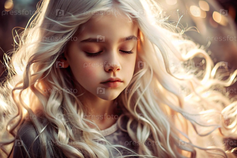 Портрет красивой маленькой блондинки с длинными волнистыми волосами и вдумчивым взглядом.Волосы развиваются и создают ощущение легкости и естественности