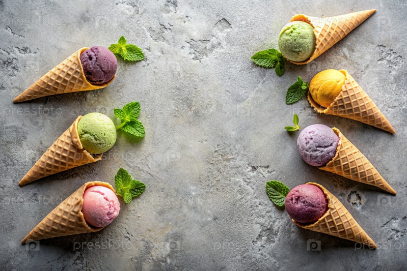 сладкий десерт. морозильные шишки с различными вкусами на бетонном сером фоне. Всемирный день мороженого