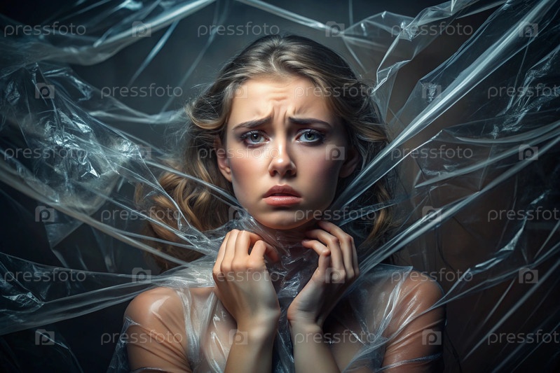 Девочка завернута в целлофан или сумку. Девушка задыхается. Пластиковое загрязнение планеты. Опасность для окружающей среды. Сокращение повторного использования пластика. Переработка. Концепция мусора