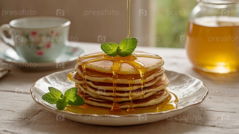 Вкусные блины с медом и листьями мяты на стильной тарелке в бежевой кухне.Концепция российского праздника Масленицы