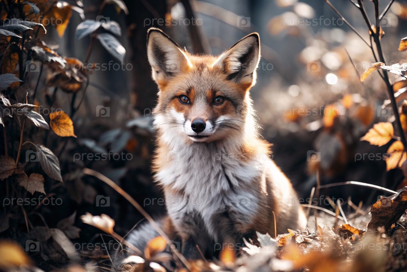 Красная лиса, сидящая среди осеннего листвы.Охота на животных