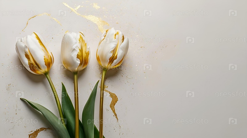 Тюльпаны - это весенние цветы. Красивый цветочный фон с красивым эффектом боке. Пузырьки тюльпана на белом акварельном фоне со золотыми венами