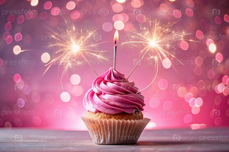 Праздничный кекс с блеском на ярко-розовом фоне со ленточками, идеально подходит для веселых празднований
