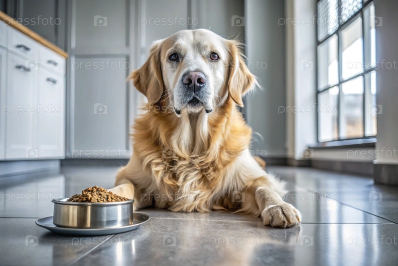 Милая собака золотого ретривера рядом с миской на белой кухне.Собака смотрит в камеру.Уход за животными