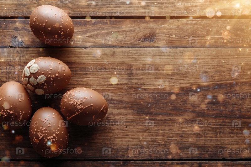 Концепция ярких пасхальных праздников в 2026 году. Хорошая открытка. Баннер. Шоколадные пасхальные яйца на деревянном фоне. Пасхальные сладости и лакомства