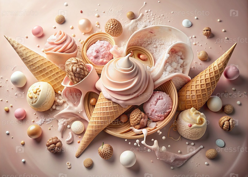 Абстрактная композиция с таяющим мороженым. Плески и брызги мороженого. натюрморт, изображающий перевернутый конус мороженого на светло-розовом фоне