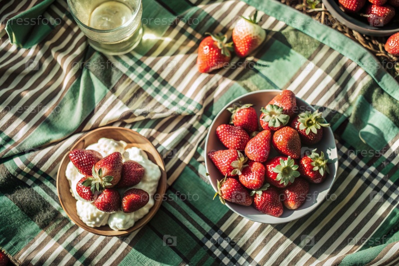 Летний пикник.Вкусные свежие клубники в стильной тарелке на постельном одеяле в парке.Вид сверху, есть место для копирования