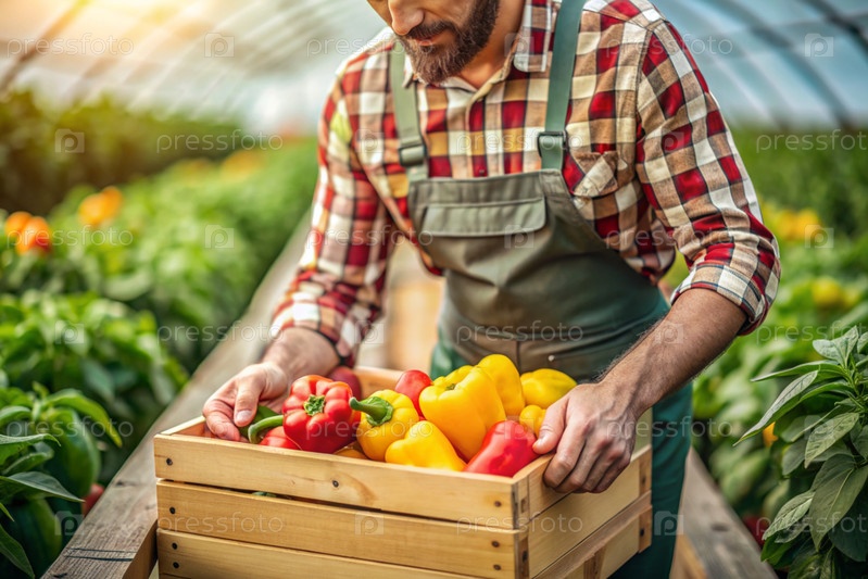 Сельскохозяйственная промышленность. деревянный ящик с перцем в руках фермера. садовник собирает богатый урожай в теплице