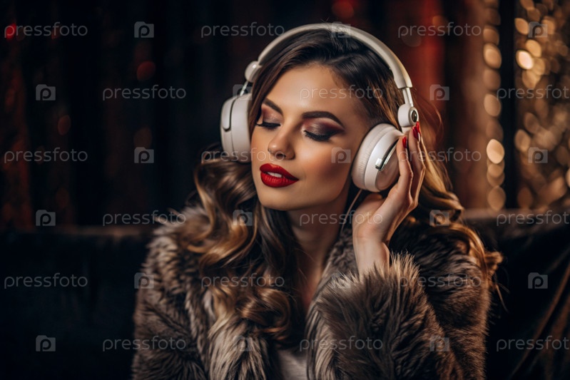 Молодая красивая гламурная девушка с большими наушниками и ярко-красной помадой, слушающая музыку на ушах