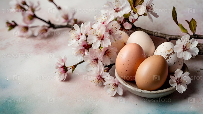 Нежные пасхальные яйца и вишневые ветви цветут на пастельном акварельном фоне с нежными полосками