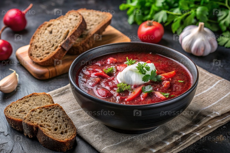 Традиционный украинский и российский борщ в стильной керамической тарелке с травами, сметаной и чесноком