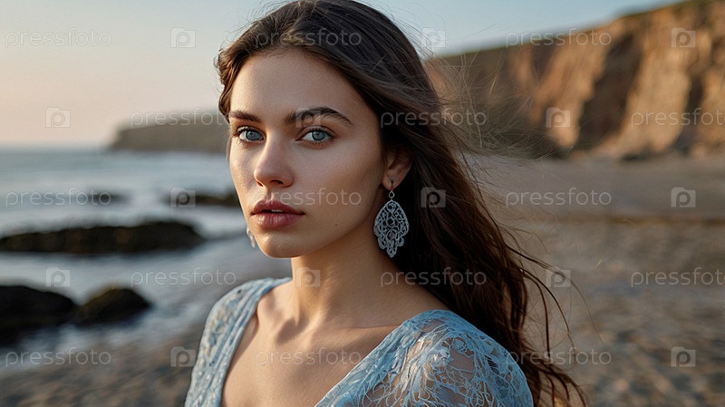 Портрет красивой женщины на пляже перед морем.Романтическая, спокойная и чувственная фотография девушки в проветренном нежном платье