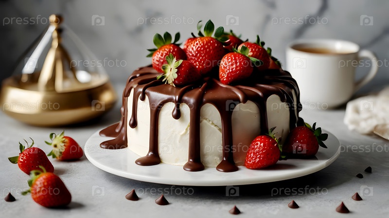 Концепция праздничных блюд. Пекарня. Красивый вкусный торт со свежими клубниками и шоколадом на столе. День рождения и сладости