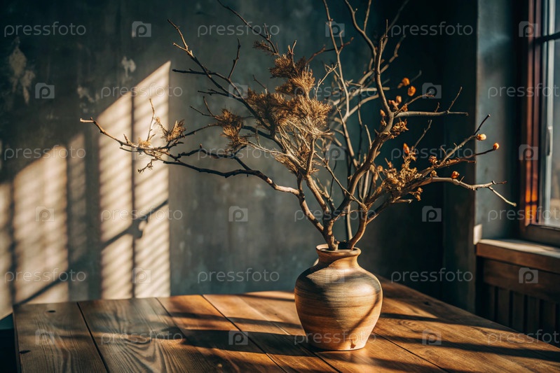 Ветви с золотыми осенними листьями в керамической вазе на деревянном столе у окна. Концепция домашнего комфорта. Осенний декор для Хэллоуина