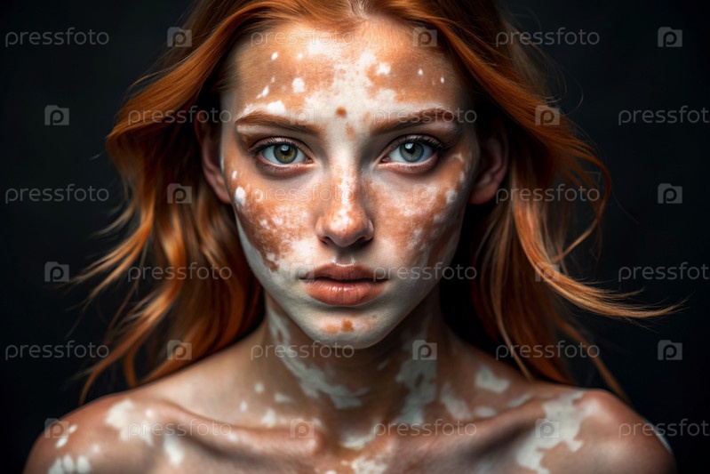 Лейкодермия. Витилиго. Плохая пигментация кожи. Большие белые пятна по всему телу и лицу. Портрет красивой девушки с кожными заболеваниями