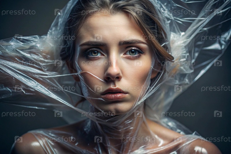 Девочка завернута в целлофан или сумку. Девушка задыхается. Пластиковое загрязнение планеты. Опасность для окружающей среды. Сокращение повторного использования пластика. Переработка. Концепция мусора