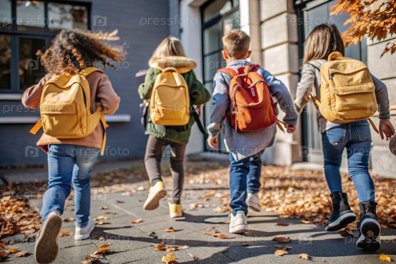 Праздник приходится на 1 сентября. Дети с желтыми рюкзаками бегут в школу. Обратный взгляд. Давайте вернемся в школу. Концепция нового учебного года в школе. Осенний день знаний