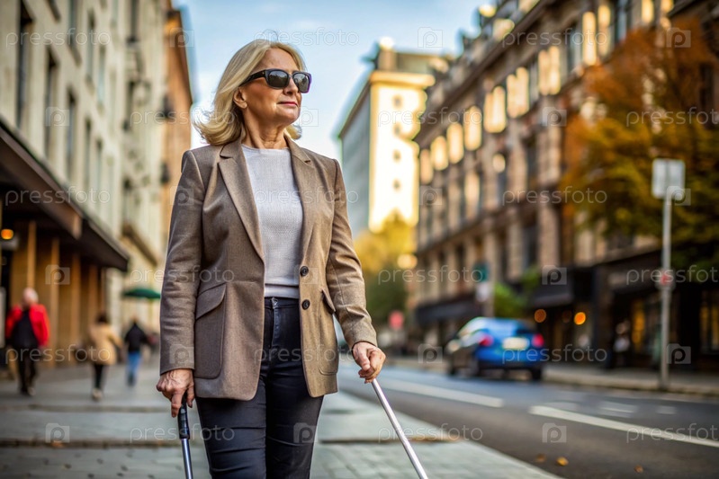 Инвалидность. Потеря зрения. Слепая женщина с тростью и солнцезащитными очками идет по городской улице. Международный день слепых 13 ноября