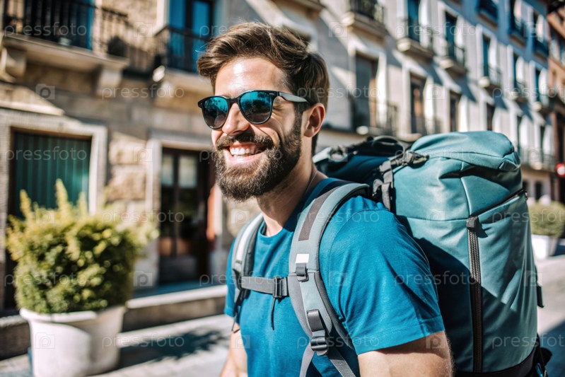 Портрет счастливого красивого хипстера-путешественника с рюкзаком и солнцезащитными очками. Сольное путешествие, образ жизни. Молодой турист наслаждается отдыхом в солнечный день
