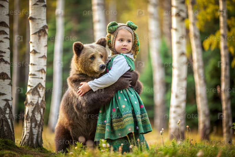 Красивая маленькая девочка в русской народной одежде и с платками на голове в березовой роще с живым медведем Русский фольклор, славянская мифология
