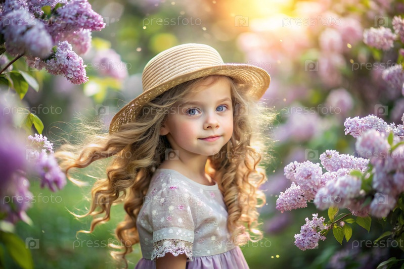 Портрет красивой маленькой кудрявой 4-летней девочки в соломенной шляпе и платье в цветущем лиловом саду. Детство. Ребенок позирует и смотрит на камеру