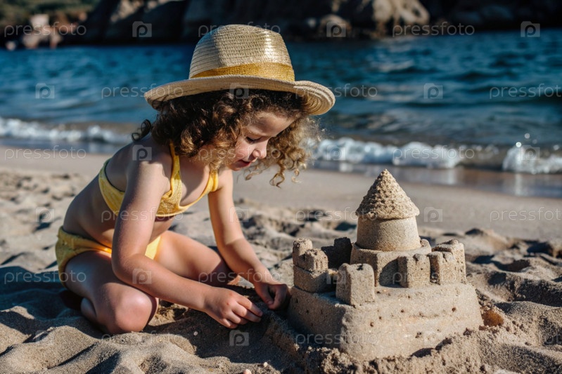 Красивая маленькая кудрявая девочка в желтом купальном костюме строит на пляже песчаный замок у моря.Концепция отдыха с детьми, туризма и летних каникул у воды