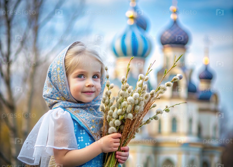 Неделя пальмовых деревьев. христианство. портрет трехлетней девочки в русском народном шале с ветвями ивы в руках на фоне церкви и заката