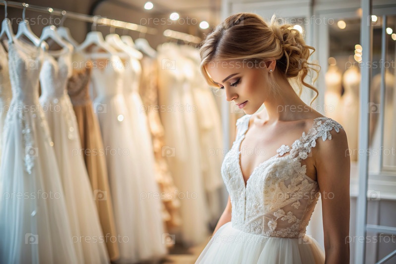 Аренда и покупка свадебных платьев для мероприятий. близко. красивая девушка Невесна пробует на себе элегантное белое свадебное платье в роскошном брачном салоне