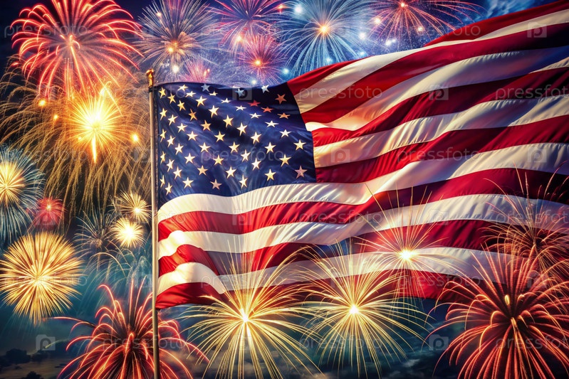 Флаг США с фейерверком в небе День независимости - 4 июля под открытым небом