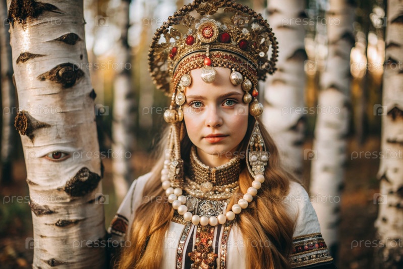 Красивая девушка в традиционном русском национальном костюме.Перед березовым ростом.Портрет символизирует традиции и красоту русского народа