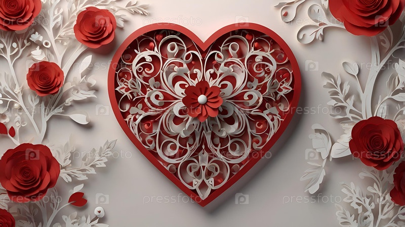 Концепция Дня святого Валентина с красным сердцем, изображающим Любовь. Стильный дизайн бумажных цветов. Копировальное пространство