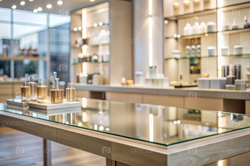 Минимальный фон для демонстрации продукта. Современная стеклянная подиум в современном магазине косметики. Элегантный дизайн для презентации косметической продукции